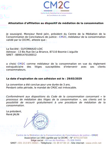 Le Prestataire met à la disposition du Client un dispositif de médiation des litiges de la consommation, accessible en ligne sur internet ou par courrier auprès du CM2C (Centre de la Médiation de la Consommation de Conciliateurs de Justice) : https://www.cm2c.net – CM2C, 49 rue de Ponthieu – 75008 PARIS.